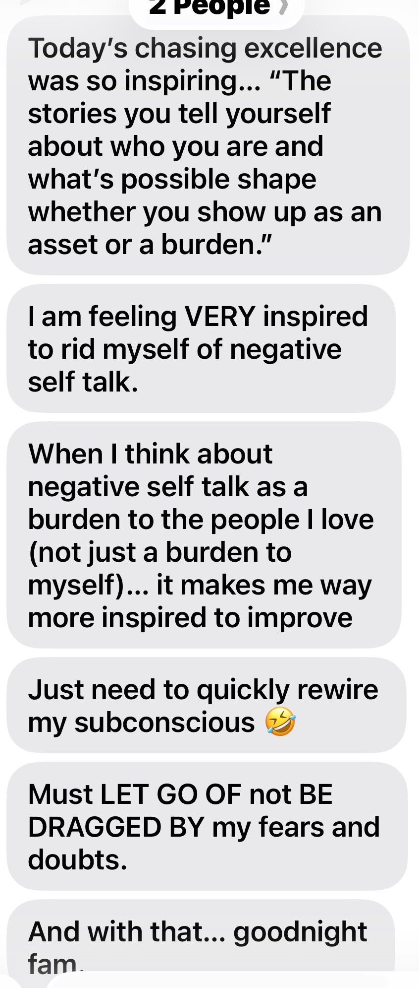 Earlier this week, we were in a separate text conversation with one of her friends. Different situation, same theme. This one wasn’t about someone else’s tone or insecurity. It was about her own voice inside her head. The running commentary. The quiet self-criticism. The habit of replaying mistakes and magnifying them. She was frustrated with herself for not being able to drop it. For letting one small thing color an entire day.